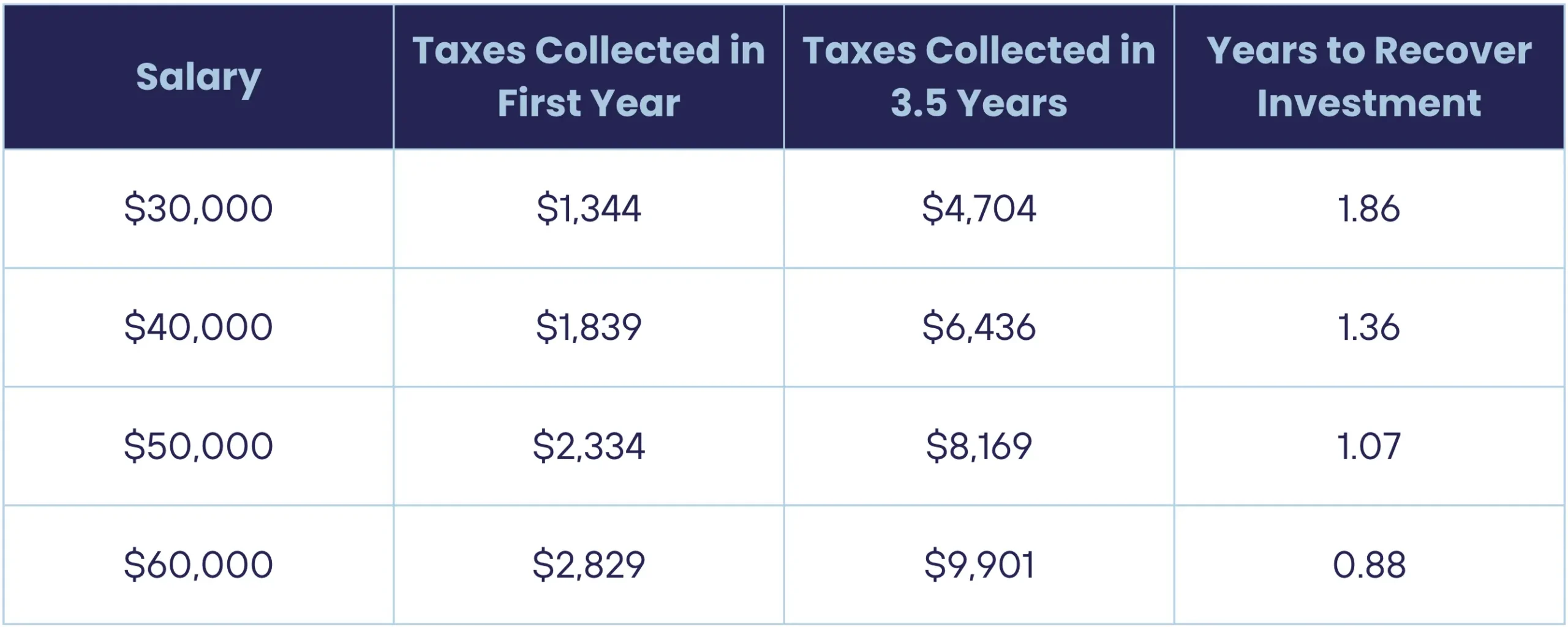 The median employee tenure across all U.S. private-sector businesses is 3.5 years. This means that for a $40,000 employee, the state stands to collect more than $6,000 in income tax over the typical tenure of a new hire. Even for a $30,000 employee, the state will recover its initial investment within two years. This projection excludes potential increases in other taxes resulting from changes in disposable income.